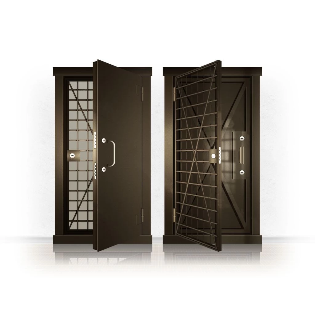 Металлические двери КХО и КХН представляют собой входные блоки, обладающие высоким уровнем взломостойкости и состоят из трех основных элементов: усиленного каркаса, сплошного металлического полотна и решетчатой двери. Дверной блок изготавливается из стального уголка 100*100 мм. Места крепления блока к стене цементируются и закрываются стальными наличниками шириной 40 мм. Крепеж заходит вглубь стены на 80 мм. В конструкции внешней створки монтируются ребра жесткости, для обшивки используется сталь толщиной не менее 3 мм. Внутренняя решетка изготавливается из прутка диаметром 16 мм. Размер ячеек решетки должен составлять не более 15 на 15 см. В точках пересечения прутья надежно приваривают друг к другу. В КХО и КХН необходимо поддерживать определенную температуру и влажность. Для этого внутреннее пространство глухой двери заполняется теплоизоляционным материалом, а по периметру двери приклеивается уплотнитель. Такие двери оборудуются замками с повышенным уровнем взломостойкости. Специализированные двери КХО и КХН в Балее могут быть оснащены сигнализацией, в конструкции могут быть проушины для навесного замка и элементами для опечатывания. Если идет речь о двери в комнату хранения оружия, в створке оборудуется окно для выдачи оружия и спец. средств, которое накрывается стальной дверцей.