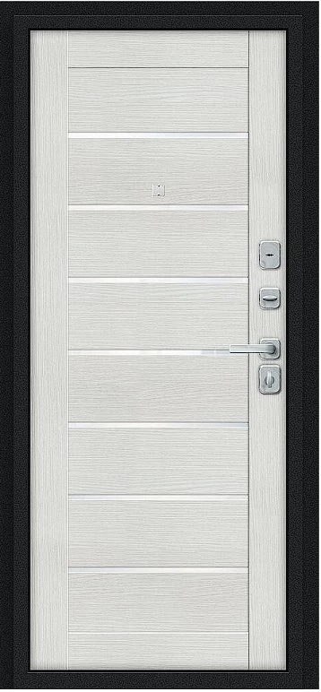 Надежная входная Дверь Браво Техно/BChrome Букле черное/Bianco Melinga премиум класса по цене 36 415 руб. Большая толщина стали защитит от проникновения в ваш дом, квартиру или коттедж. Используется очень качественная фурнитура: замки, цилиндры, ручки, защелки. Покрытие и отделка двери изготовлено под внимательным контролем производителя. Дверь имеет долгий срок службы и гарантию.